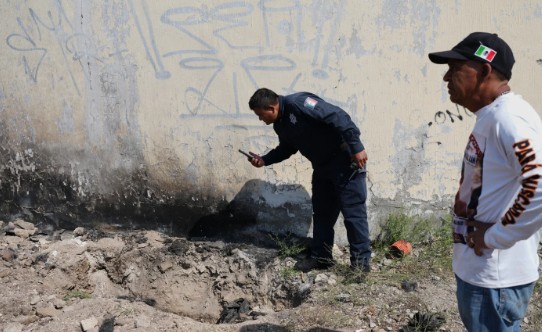 Después de horas sin avances, Servín camina entre el muro y las vías. El terreno está blando. “Vi un agujero que tenía piedras y se me hizo raro”.